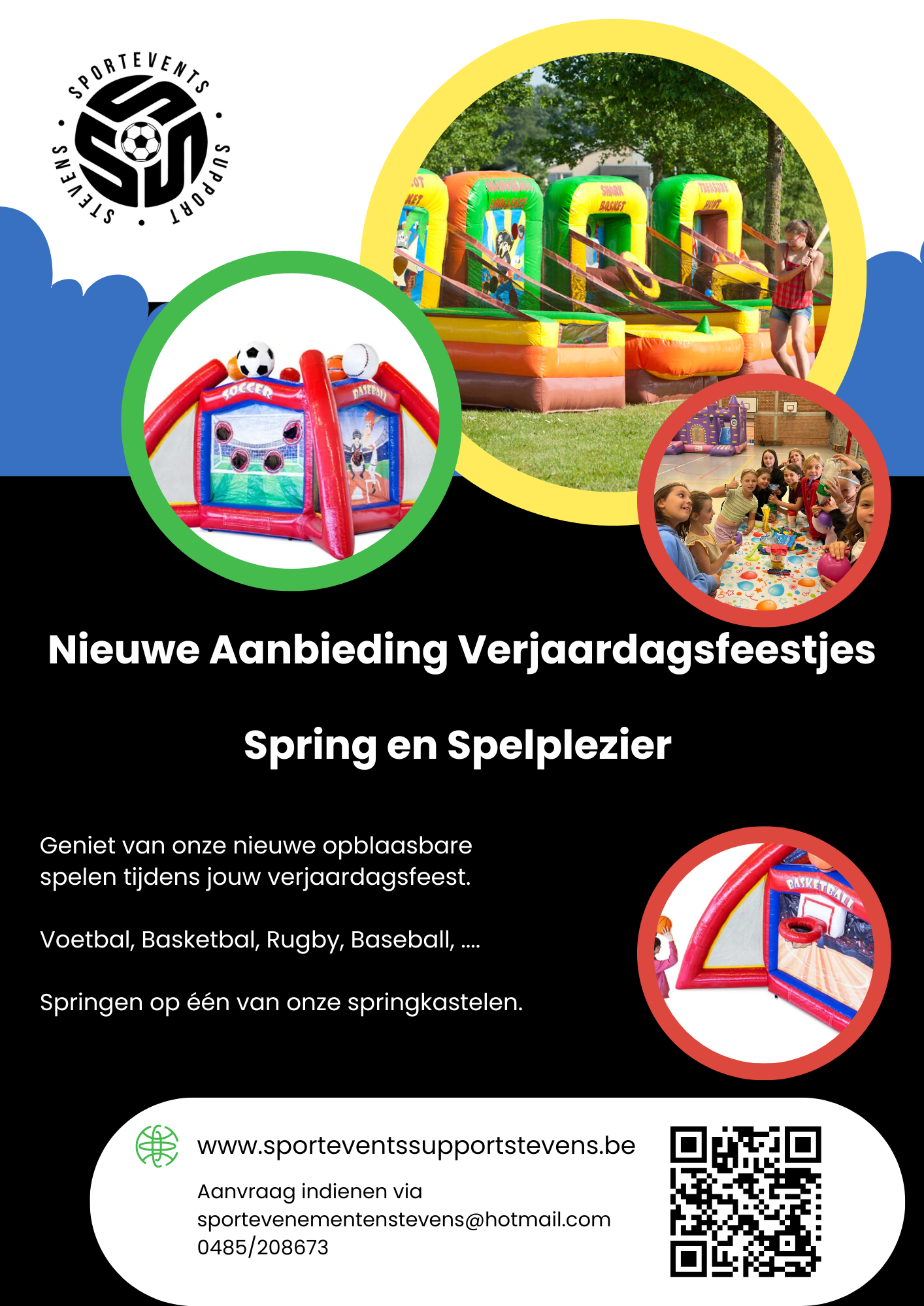 Verhuur: Hierbij vindt u de verhuur van onze Springkastelen – Stormbanen – Sportmaterialen voor scholen / verenigingen, Partytenten, Feestmaterialen en Mascottepakken.